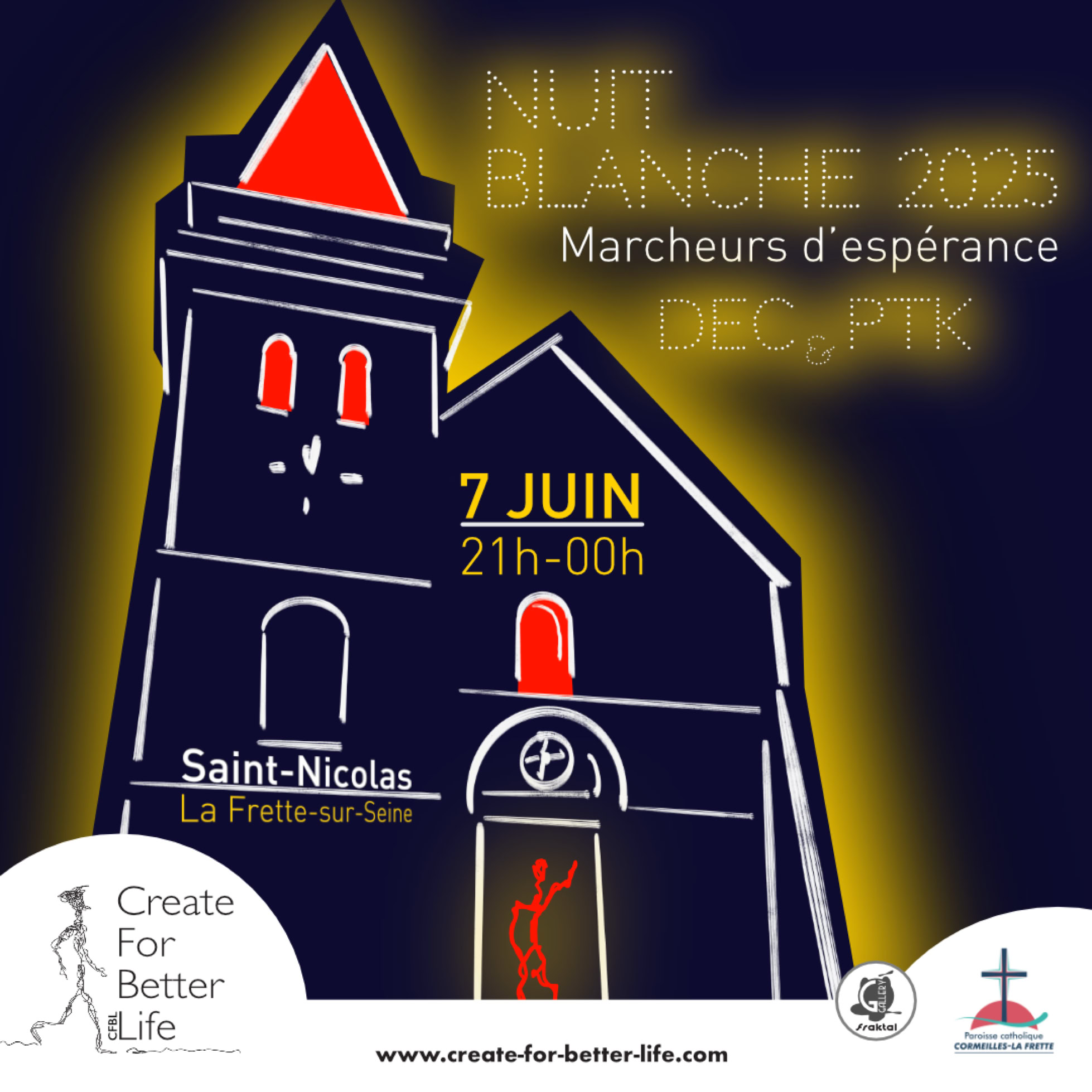 Pour une troisième édition, l'Eglise Saint-Nicolas fait sa Nuit Blanche, le 7 juin à La Frette-sur-Seine. DEC et PTK, artistes frettois délivrent un message universel, ouvert à tous. Leur installation « Marcheurs d’espérance », lumineuse et immersive, sera en accès libre dès 21h00 et jusqu'à minuit. Chacun pourra venir découvrir l'univers raconté qui respecte le lieu tout en lui attribuant une dimension audiovisuelle le temps d'une illusion de quelques heures à peine...